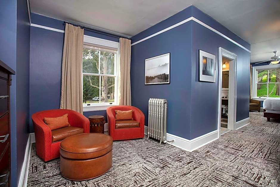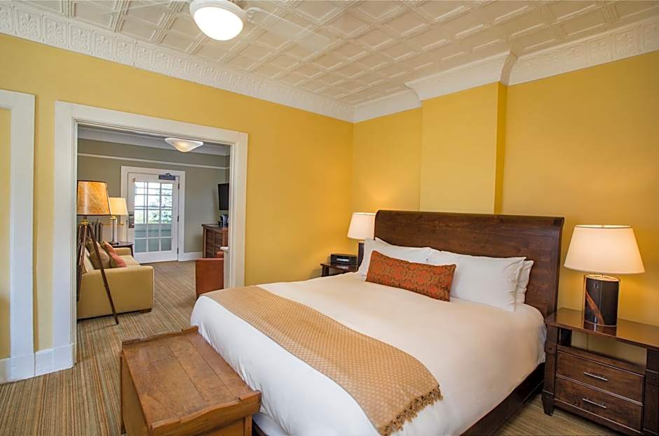 This historic room features vintage architectural details. Guests on the first floor can take advantage of a shared front porch furnished with rocking chairs.